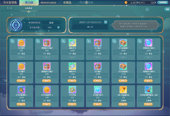 - 势力战分为两队进行,每场比赛随机分配红/蓝队。势力战/兑换商店/拍卖场只能在特定时间使用。