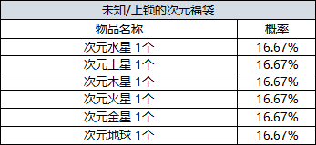 - 使用1个未知的次元福袋时,依概率可获得1个奖励道具(上锁的次元福袋可使用解锁卡片兑换为未知的次元福袋)。