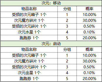 - 使用1个次元箱子,依概率可获得2个奖励道具,损坏的次元箱子可使用解锁卡片兑换为次元箱子。