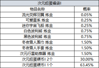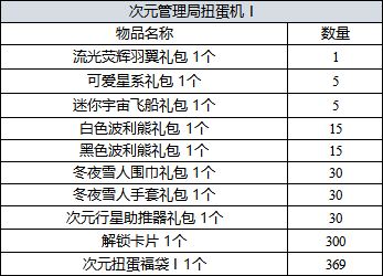 - 更新次元管理局第一期扭蛋机,使用1次消耗15个次元硬币,扭蛋机不可保管/赠礼;使用1个次元扭蛋福袋Ⅰ,依概率获得2个奖励道具。
