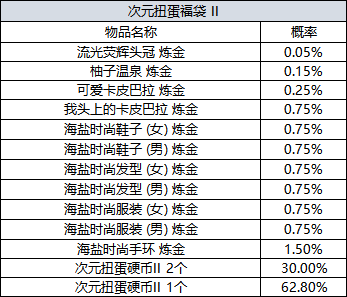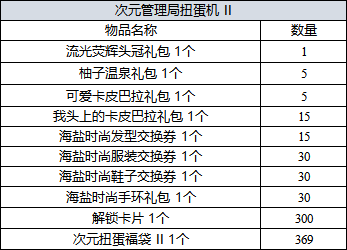 - 更新次元管理局第二期扭蛋机,使用1次消耗15个次元硬币,扭蛋机不可保管/赠礼;使用1个次元扭蛋福袋II,依概率获得2个奖励道具。