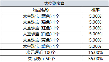 - 次元管理局交换商店更新,可兑换太空珠宝盒。使用1个太空珠宝盒,依概率可获得2个奖励道具。