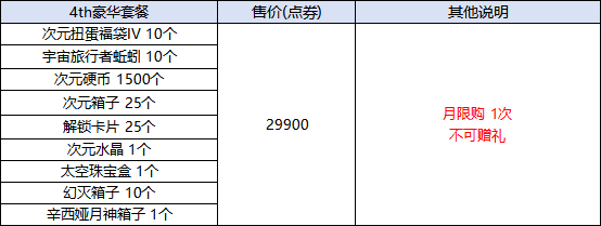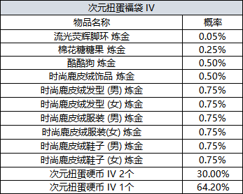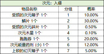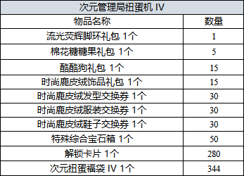 - 更新次元管理局第四期扭蛋机,使用1次消耗15个次元硬币,扭蛋机不可保管/赠礼;使用1个次元扭蛋福袋IV,依概率获得2个奖励道具。
