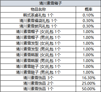 ),使用1个清川素雪箱子,依概率可获得2个奖励道具。