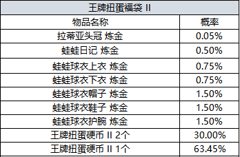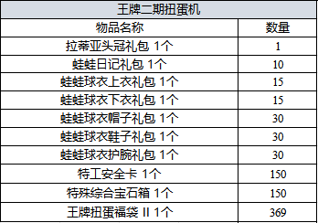 - 更新王牌第二期扭蛋机,使用1次消耗15个ACE硬币,扭蛋机不可保管/赠礼;使用1个王牌扭蛋福袋II,依概率获得2个奖励道具。