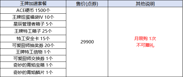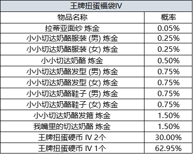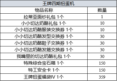 - 更新王牌第4期扭蛋机,使用1次消耗15个ACE硬币,扭蛋机不可保管/赠礼;使用1个王牌扭蛋福袋IV,依概率获得2个奖励道具。
