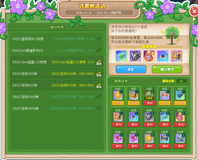 - 许愿树每日任务/物品列表/愿望点数会在每日