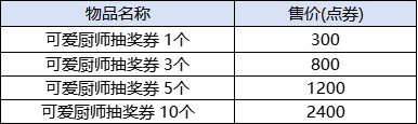 - 使用一次可爱厨师抽奖券可随机获得1个奖励道具,可选择1次或5次连续抽奖使用,连续抽5次时,可获得1次追加奖励。