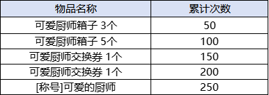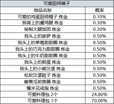 - 使用1个可爱厨师箱子,依概率可获得1个奖励道具。