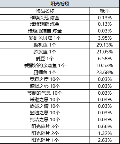 ),使用阳光蚯蚓钓鱼时依概率可获得以下列表奖励。